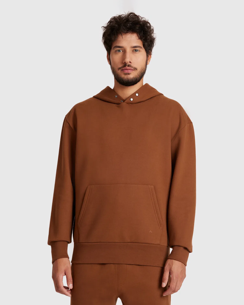 A blusa de agasalho é confeccionada em moletom de algodão e poliéster com modelagem reta. A peça possui capuz com botões metálicos de pressão, bolso frontal do tipo canguru, logo da marca em relevo do lado esquerdo do bolso, mangas longas e acabamentos canelados. Este Moletom é uma collab Aramis + Cauã Reymond da coleção Inverno/23.